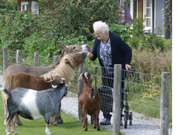 Wat vraagt dit nou van de zorgorganisatie? Smit: ‘Op de eerste plaats: kleinschalige zorg. Dat wil zeggen: huiselijke groepswoningen in een stimulerende woonomgeving waar van alles te beleven is. En voor elke groep een vast team van goed opgeleide mensen, die kennis hebben van de moderne inzichten over dementie’. Volgens Smit moeten ze niet allemaal dezelfde opleiding hebben, maar juist verschillende; dat verrijkt. ‘In onze zorgboerderij doet een verzorgende ook groepsactiviteiten, een SPW-er doet ook de lichamelijke verzorging. Door hun verschillende achtergrond leren ze van elkaar’.